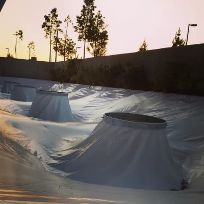 El cliente solicitó una cubierta que trabajara con la ausencia de elementos estructurales sobre el patio (planta libre). Para esto se diseña una cubierta de 4 conos soportados por pilares suspendidos del suelo mediante cables de acero anclados a un marco perimetral.