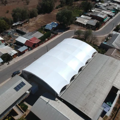 Como una gran visera, la tensoestructura entrega protección ante el alto asoleamiento característico en la zona.
