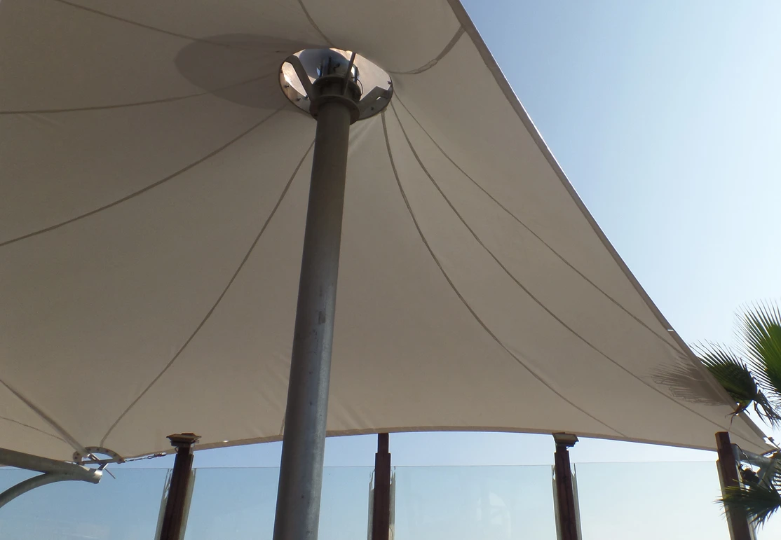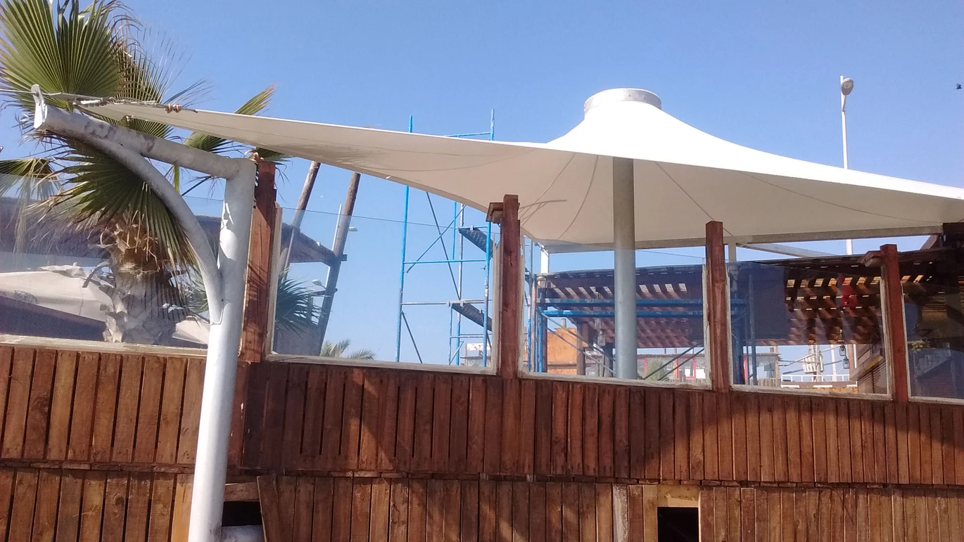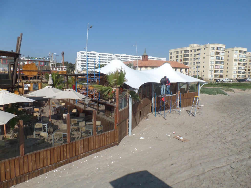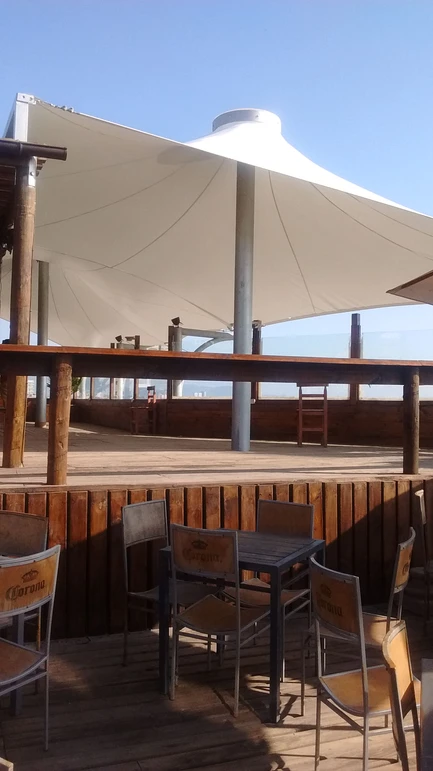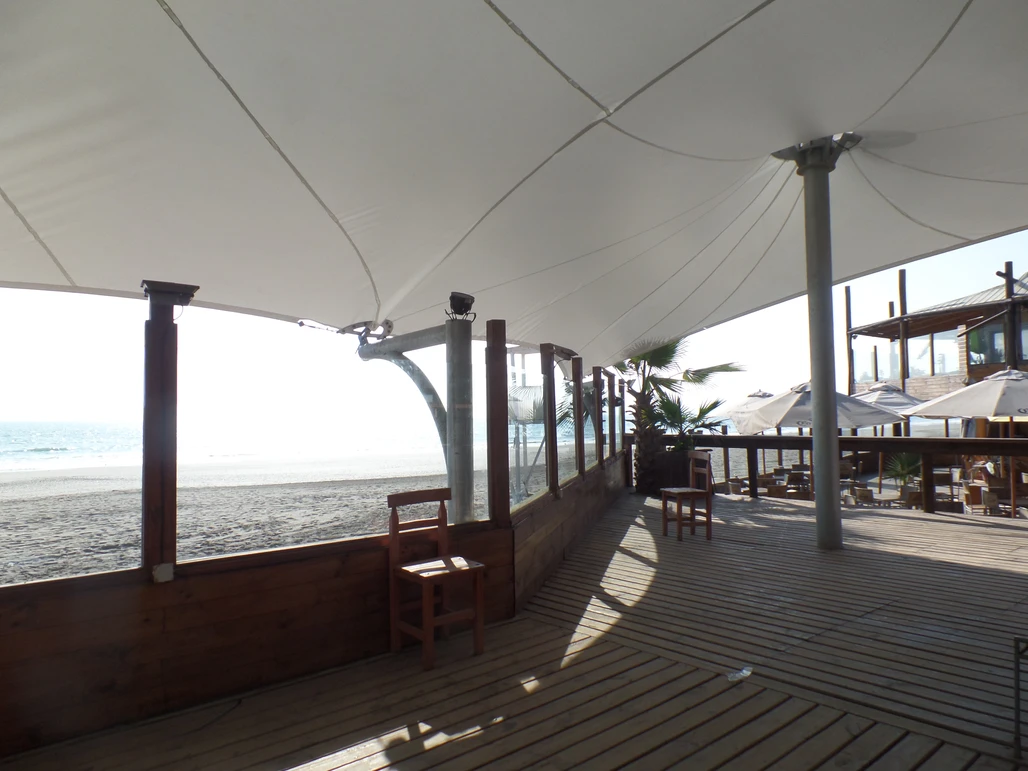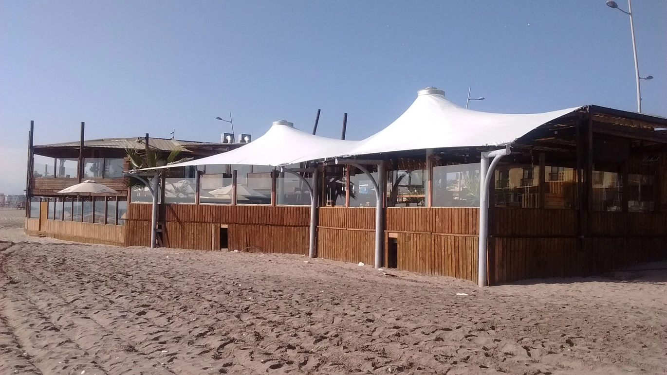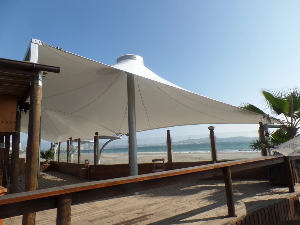 Membrana tensada por medio de dos conos que se levantan y distinguen la cubierta a la distancia y desde la playa.