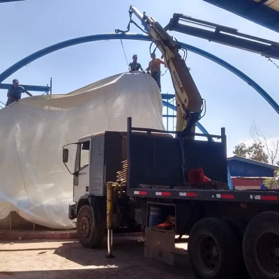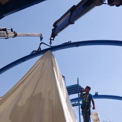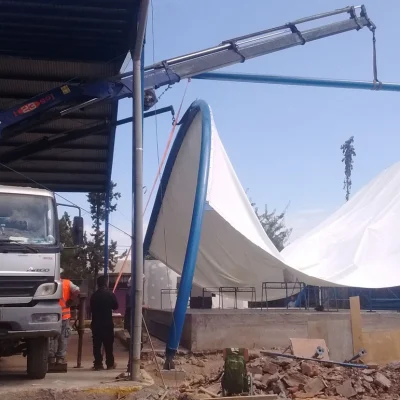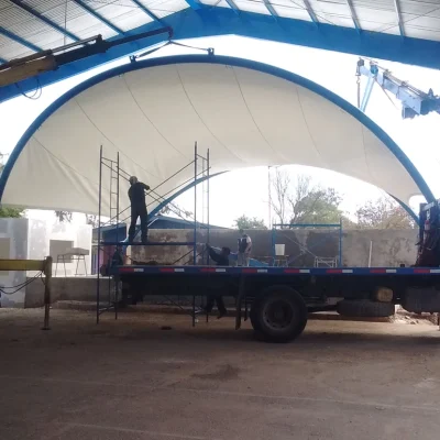Dos grandes vigas curvas cruzan el escenario apoyándose en solo 2 puntos. Los dos marcos son sostenidos por la membrana que trabaja en conjunto con ellos, logrando la tensión necesaria para una cubierta que permite la evacuación de agua lluvia, resistencia al viento y protección UV.