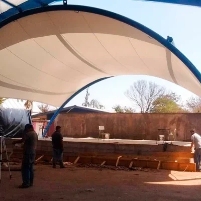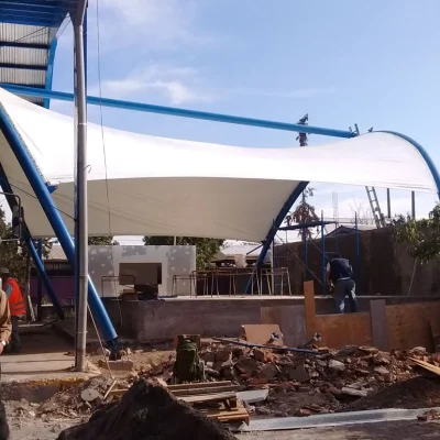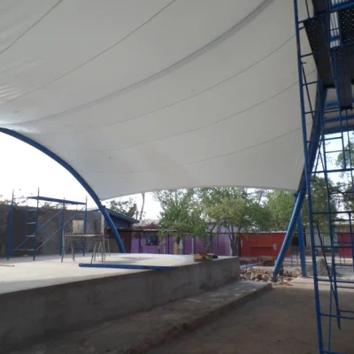 La cubierta tensada se construye para cubrir un espacio de encuentro y escenario de actividades escolares.