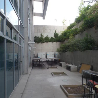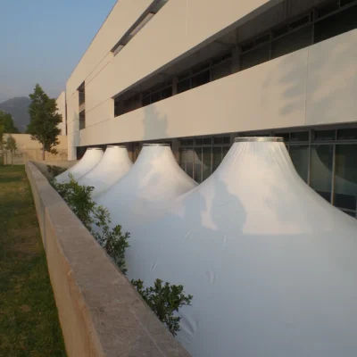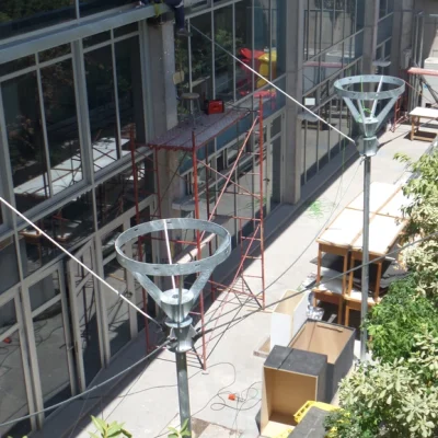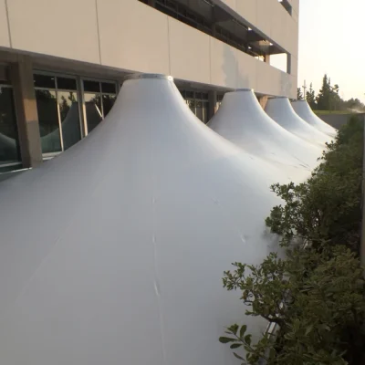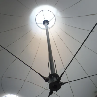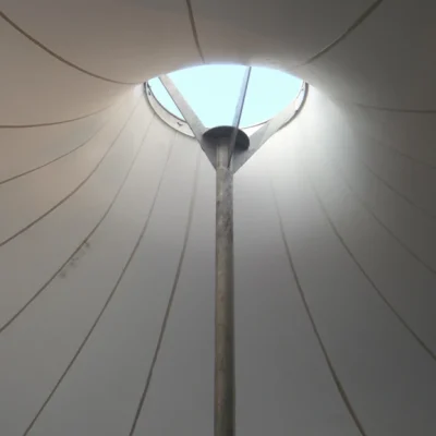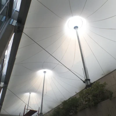 El cliente solicitó una cubierta que trabajara con la ausencia de elementos estructurales sobre el patio (planta libre). Para esto se diseña una cubierta de 4 conos soportados por pilares suspendidos del suelo mediante cables de acero anclados a un marco perimetral.