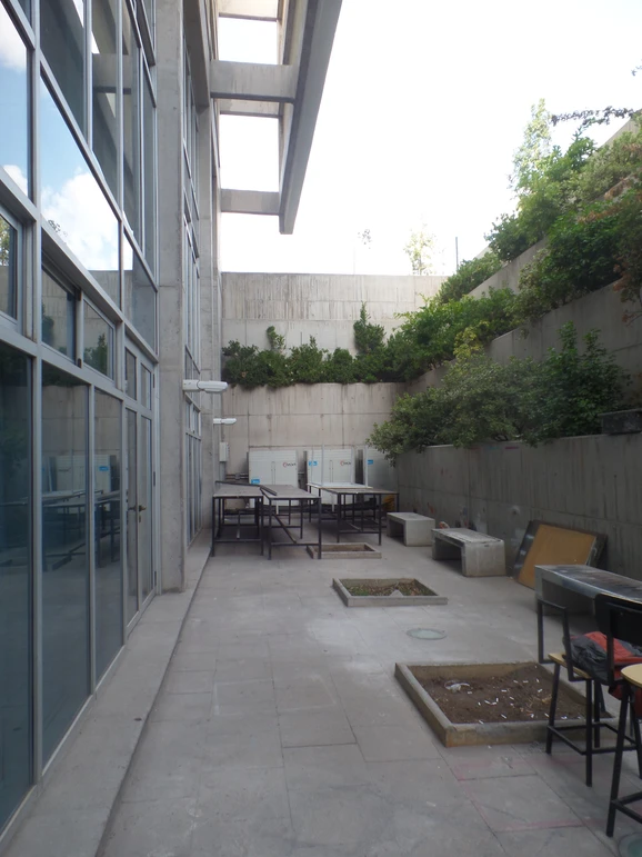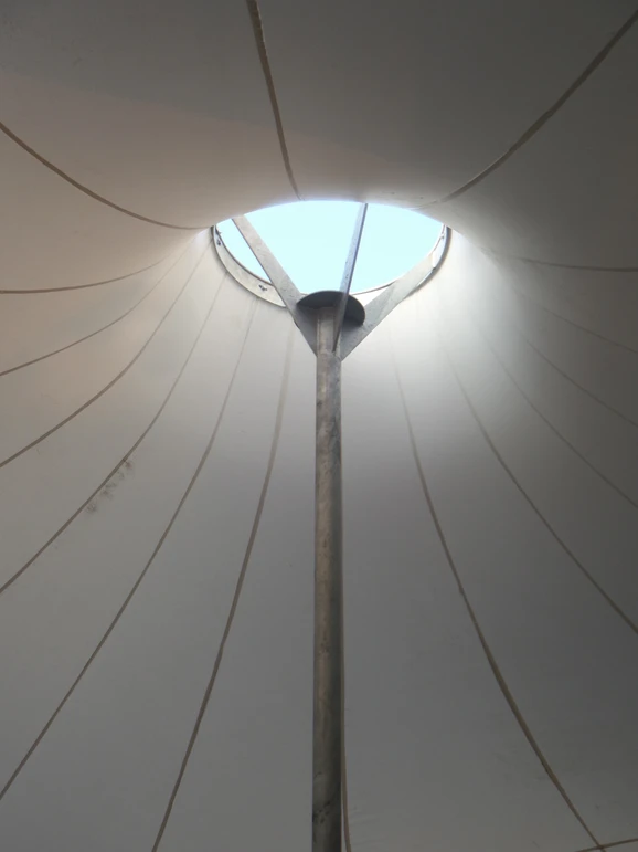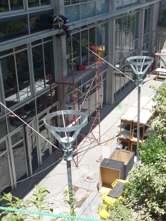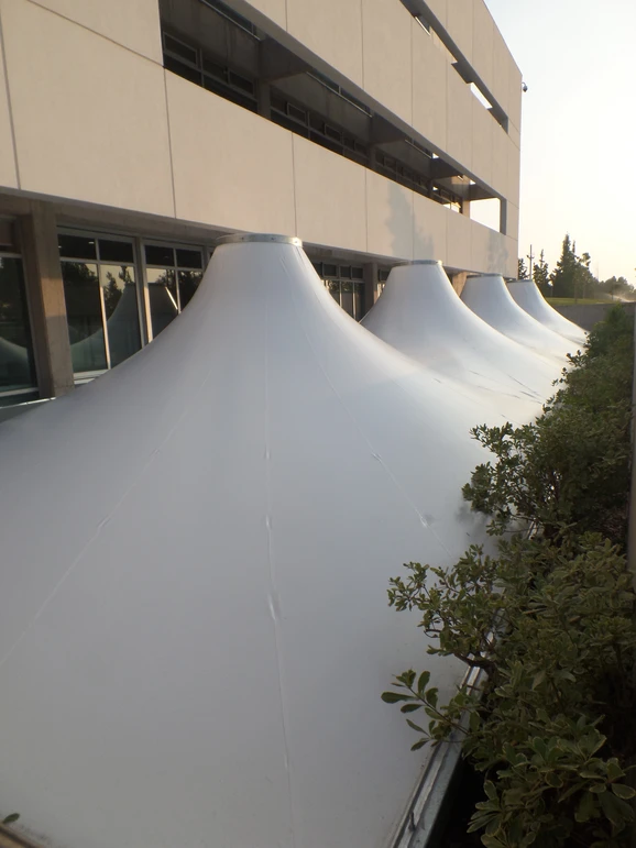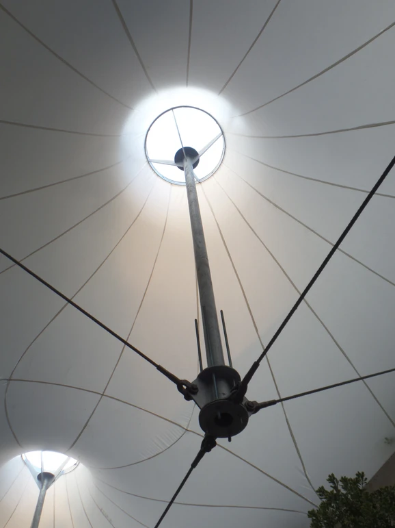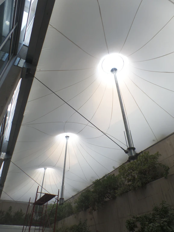 El cliente solicitó una cubierta que trabajara con la ausencia de elementos estructurales sobre el patio (planta libre). Para esto se diseña una cubierta de 4 conos soportados por pilares suspendidos del suelo mediante cables de acero anclados a un marco perimetral.